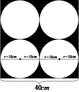 Sabemos que o raio de cada circunferência mede 10 cm, portanto o diâmetro de cada circunferência medirá 4 cm. Existe uma relação entre o lado do quadrado e o diâmetro da circunferência, observe ilustração: