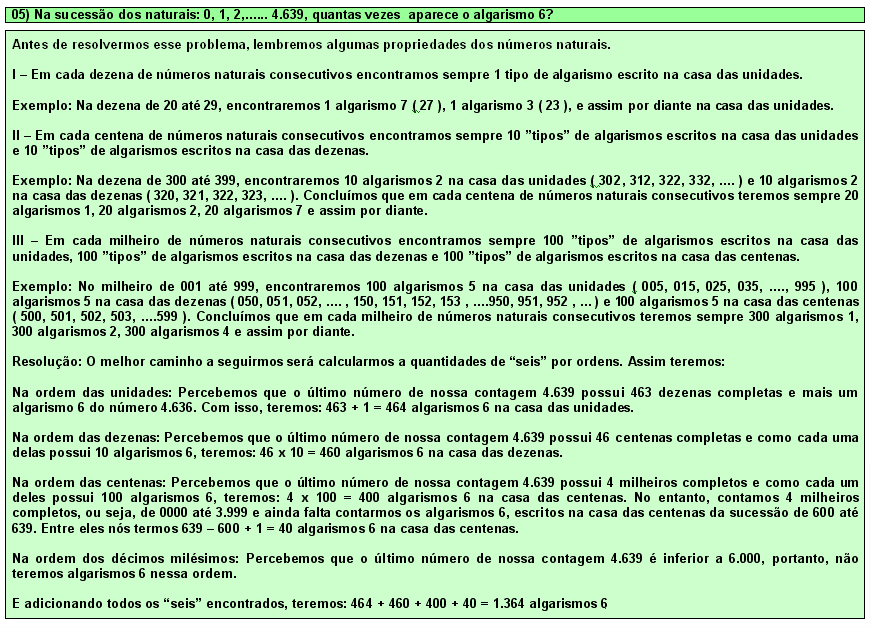 36) Na sucessão dos naturais : 0, 1, 2, ........4 639, quantas vezes aparece o algarismo 6 ?