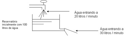 Neste exemplo, o sistema, que no caso é o reservatório de água, apresenta um balanço de massa com um acúmulo negativo de 10 litros por minuto.