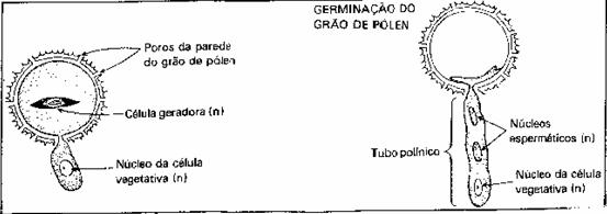 Após a polinização inicia-se a germinação do grão de pólen. Forma-se o tubo polínico que crescem penetrando no estilete em direção ao ovário. À medida que isto ocorre, a célula geradora e o núcleo da célula vegetativa (núcleo vegetativo) migram para o tubo polínico. A célula geradora sofre divisão mitótica e dá origem a dois núcleos espermáticos, que são os gametas masculinos.