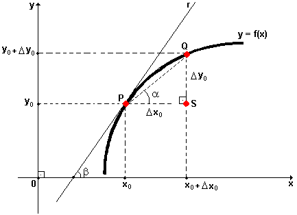 Observe que quando D x0 ® 0 , o ponto Q no gráfico acima, tende a coincidir com o ponto P da mesma figura., definindo a reta r , que forma um ângulo b com o eixo horizontal (eixo das abcissas), e, neste caso, o ângulo SPQ = a .tende ao valor do ângulo b .