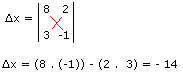Perceba que, na tabela acima, as colunas correspondem aos valores que estão na frente das duas equações inicialmente dadas (os coeficientes de x e y). x por exemplo, ficará 1, 3x, ficará 3, 2y, ficará 2, e -y, ficará -1. Os números são colocados na posição igual à das equações, e multiplicados em “xis”. O resultado da segunda multiplicação (2 . 3)deve ser subtraído da primeira (1 . (-1) . Então no final teremos, -7 para ∆p. Agora, temos que calcular ∆x e ∆y. É a mesma coisa, só que no lugar dos valores de x e y, colocamos os valores dos resultados das equações. Observe: