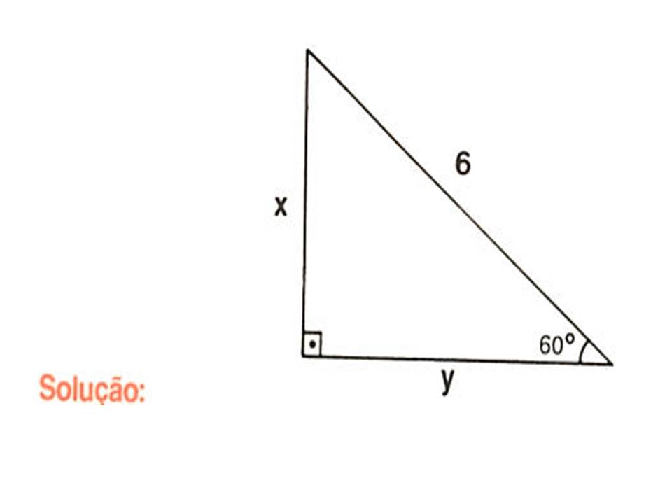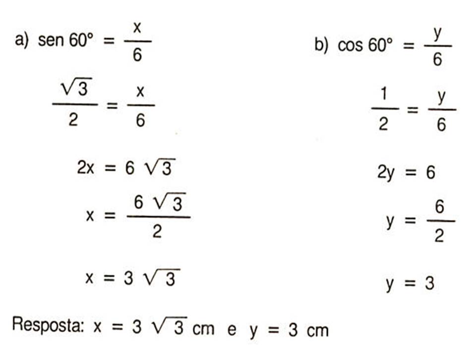 2) Calcular os catetos de um triângulo retângulo cuja a hipotenusa mede 6 cm e um dos ângulos mede 60º