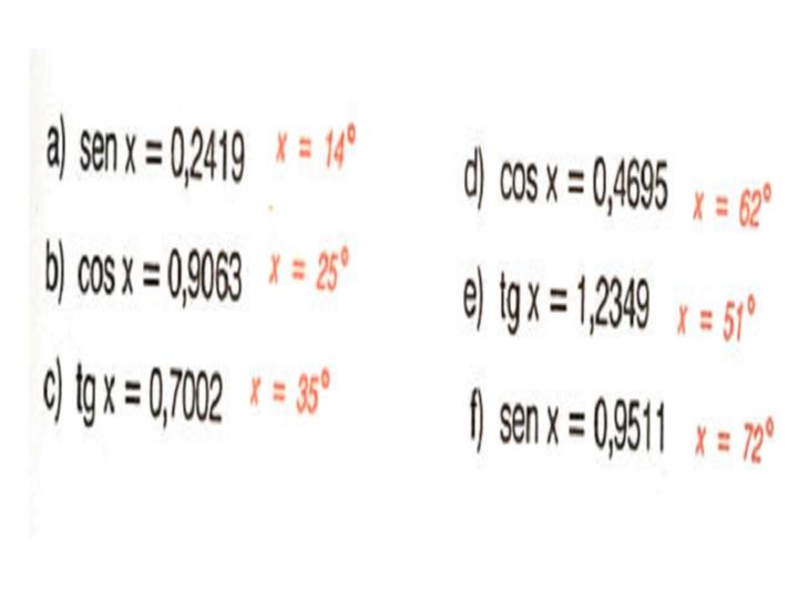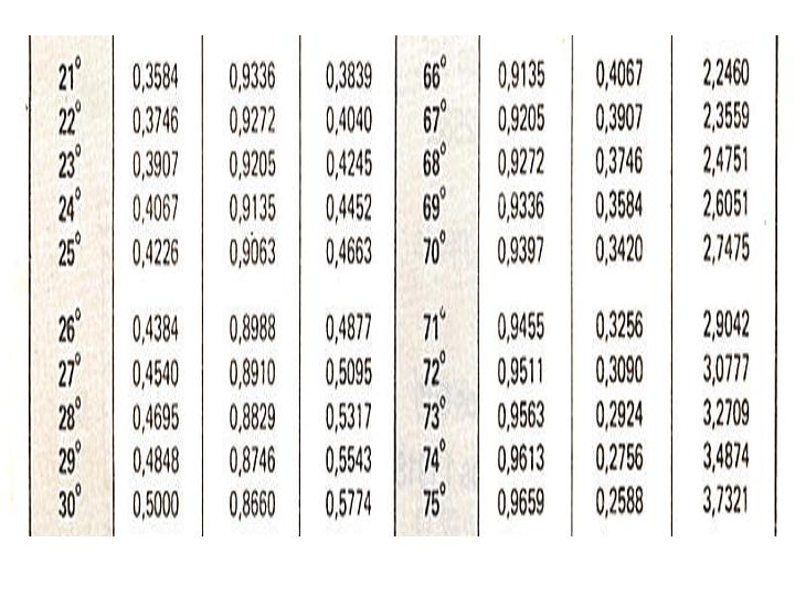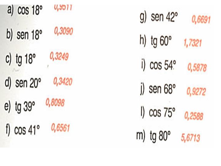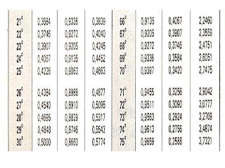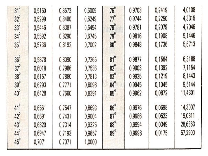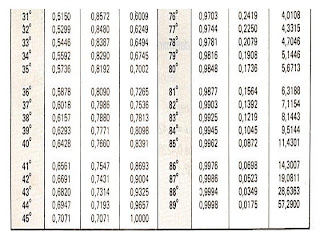 Os valores aproximados dos senos, cossenos e tangentes dos ângulos de 1º a 89º são encontraods na tabela a seguir.