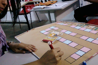 O jogo será da seguinte forma: o primeiro jogador lançará o dado; o número que aparecer no dado será a quantidade que o competidor avançará com a sua tampinha. Se a tampinha se posicionar na cor rosa, por exemplo, o jogador terá que escolher um cartão da mesma cor e responder o problema escrito nesse cartão. Respondendo corretamente, ele avançará uma “casa” na trilha; se omitir a resposta ou errar o problema, retrocederá uma “casa”. Se, por acaso, a tampinha se posicionar na cor azul, o participante deverá responder a questão e avançar duas “casas”, quando a pergunta for respondida corretamente, mas, caso erre deverá voltar duas “casas”. Em último caso, se o jogador parar na cor marrom, irá responder ao desafio do jogo e se errar estará sujeito as seguintes determinações que dependerão da complexidade do problema: