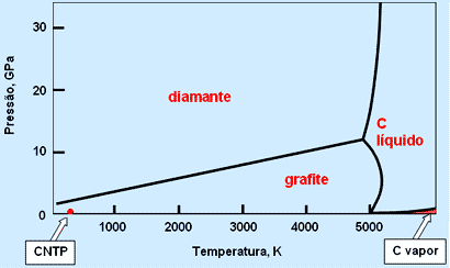 A ilustração a seguir é um diagrama de fases (parecido com o que se estuda para água e gelo, por exemplo). Note que uma pressão de 1 GPa (gigapascal) é equivalente a mais ou menos 10000 atmosferas.