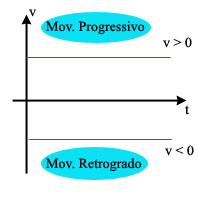 O movimento de um corpo pode ser descrito através de fórmulas matemáticas, como foi mostrado na função horária dos espaços. Se for possível representar um movimento através dessas fórmulas, também será possível representá-lo através de gráficos, que são uma forma muito eficiente de se mostrar a progressão dos resultados. No movimento uniforme, os gráficos mais usados são o de velocidade em função do tempo e o do espaço em função do tempo. Velocidade em função do tempo Vimos que o movimento uniforme é caracterizado por um movimento com velocidade constante. Por isso, o gráfico será representado por uma reta paralela ao eixo do tempo. Se a reta estiver acima do eixo do tempo, o movimento será progressivo. Se estiver abaixo do eixo do tempo, o movimento será retrógrado.